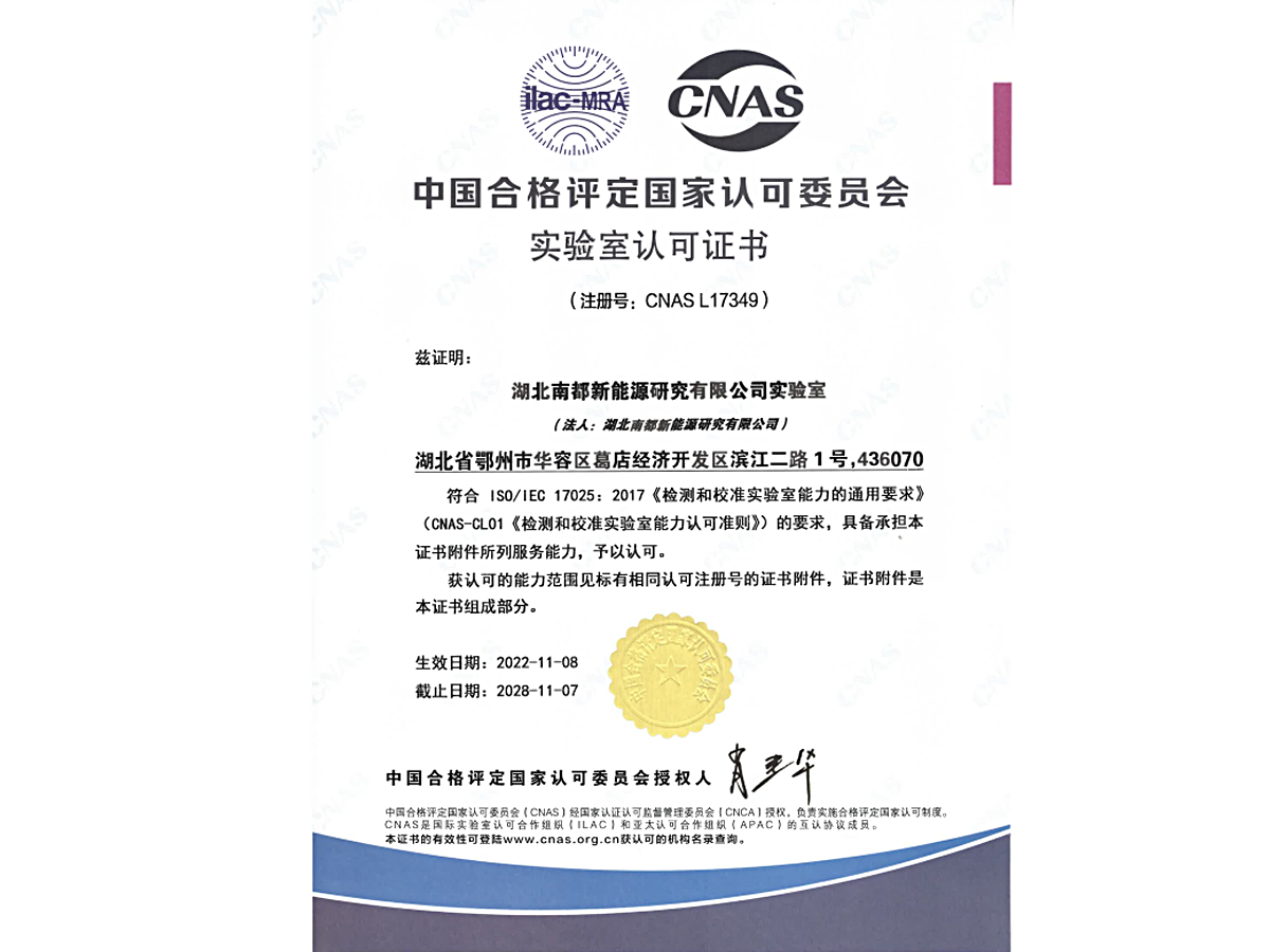 日前,湖北南都新能源研究有限公司(简称“湖北研究院”),正式通过中国合格评定国家认可委员会(CNAS)的认可,荣获CNAS实验室认可证书(注册号:CNAS L 17349)。